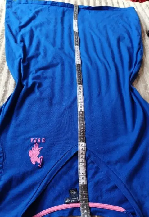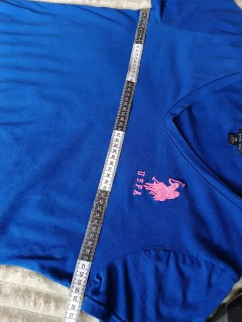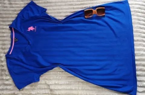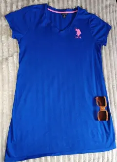Prenda de la marca U.S. Polo Assn en color azul con logo rosa bordado al frente, talla XL. Confeccionada en 100% algodón, puede usarse como blusa larga o vestido casual, cómoda e ideal para un look con estilo.