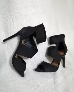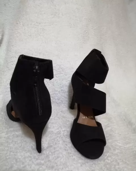 Hermosa zapatilla color Negra textura suave de gamuza con cierre detrás, diseño tiras cruzadas, altura suela tacón de 10cm. México Número #24cm. Pregúntame o visita mi closet para más modelos y númeración. En tu primer compra dentro de la app se te descuenta -$100 usa mi código Promocional.