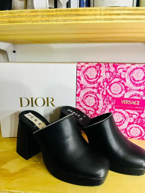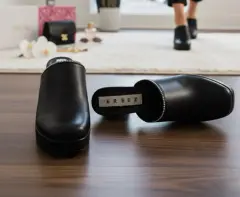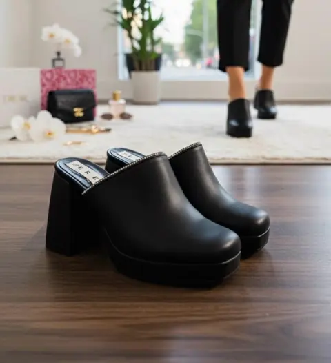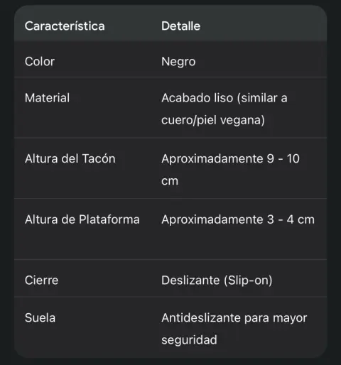 Talla 4 Diseño Clásico Renovado: La silueta tipo mule ofrece un diseño atemporal, fácil de poner y quitar, que se complementa con una moderna punta cuadrada y redondeada, en tendencia y cómoda.• Piel o Material de Acabado Premium: La parte superior presenta un acabado liso y negro intenso que sugiere un material de alta calidad (como piel vegana o cuero), fácil de limpiar y mantener, que aporta un toque de lujo sutil.• Tacón Bloque Robusto: Cuenta con un tacón grueso y sólido que no solo proporciona una elevación impresionante, sino que garantiza máxima estabilidad y soporte durante todo el día.• Plataforma Compensada: La plataforma delantera (aproximadamente 3-4 cm) reduce la inclinación percibida del tacón, ofreciendo la altura de un tacón alto con la sensación de un tacón más bajo, aumentando el confort al caminar.• Detalle de Cadena Brillante: Un sutil pero elegante detalle de cadena o pedrería fina recorre el borde superior de la pala, añadiendo un toque de brillo distintivo y sofisticación al calzado.