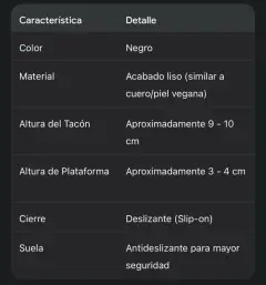 Plataforma elegante. Talla 4 Diseño Clásico Renovado: La silueta tipo mule ofrece un diseño atemporal, fácil de poner y quitar, que se complementa con una moderna punta cuadrada y redondeada, en tendencia y cómoda.• Piel o Material de Acabado Premium: La parte superior presenta un acabado liso y negro intenso que sugiere un material de alta calidad (como piel vegana o cuero), fácil de limpiar y mantener, que aporta un toque de lujo sutil.• Tacón Bloque Robusto: Cuenta con un tacón grueso y sólido que no solo proporciona una elevación impresionante, sino que garantiza máxima estabilidad y soporte durante todo el día.• Plataforma Compensada: La plataforma delantera (aproximadamente 3-4 cm) reduce la inclinación percibida del tacón, ofreciendo la altura de un tacón alto con la sensación de un tacón más bajo, aumentando el confort al caminar.• Detalle de Cadena Brillante: Un sutil pero elegante detalle de cadena o pedrería fina recorre el borde superior de la pala, añadiendo un toque de brillo distintivo y sofisticación al calzado.