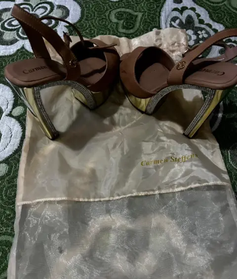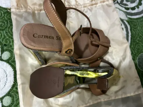 Zapatillas de marca brasileña (Carmen Steffens) gamuza, talla 3, alto 12 cm, muy cómodos, pedrería en lo alto del tacón