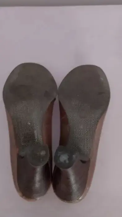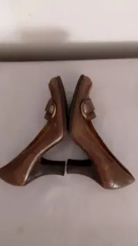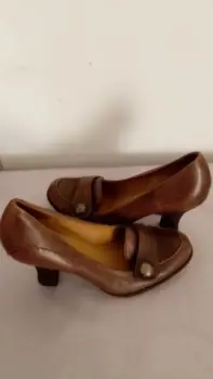 Zapatos de tacón medio, son de piel muy suave, color café degradado, botón al frente de adorno, suela antiderrapante. Sin caja.