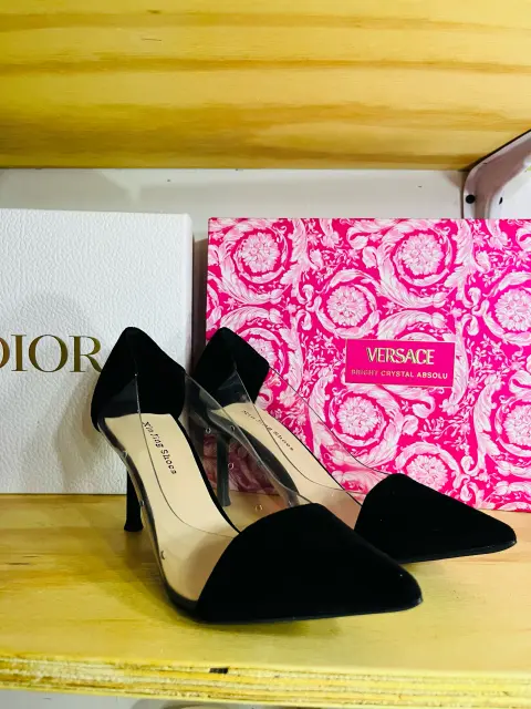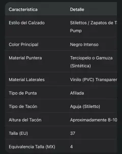 Zapatos de Tacón "Transparente Chic. fabricada en un lujoso terciopelo negro (o gamuza sintética/ante), ofrece un toque sofisticado y atemporal, ideal para cualquier evento de noche, fiesta o reunión de negocios.Lo que realmente los hace destacar es su vanguardista diseño con paneles laterales transparentes. Este material de alta calidad crea un efecto "invisible" que alarga visualiza y estiliza la pierna, asegurando todas las miradas.• Color: Negro Intenso y Transparente• Diseño: Punta afilada (stilettos)• Tacón: Tacón de aguja (aproximadamente 8-10 cm, un tacón ideal para estilizar sin sacrificar demasiada comodidad).• Cierre: Estilo pump (sin cierres, solo deslizar), fácil de poner.• Material de la Puntera: Terciopelo negro suave al tacto (o material de ante/gamuza).• Material del Lateral: Vinilo de alta calidad o PVC transparente, duradero y fácil de limpiar.📐 Talla y Equivalencia• Talla Indicada: 37 (Talla Europea)• Equivalencia de Talla Mexicana (MX): 4 (Cuatro)