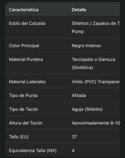 fabricada en un lujoso terciopelo negro (o gamuza sintética/ante), ofrece un toque sofisticado y atemporal, ideal para cualquier evento de noche, fiesta o reunión de negocios.Lo que realmente los hace destacar es su vanguardista diseño con paneles laterales transparentes. Este material de alta calidad crea un efecto "invisible" que alarga visualiza y estiliza la pierna, asegurando todas las miradas.• Color: Negro Intenso y Transparente• Diseño: Punta afilada (stilettos)• Tacón: Tacón de aguja (aproximadamente 8-10 cm, un tacón ideal para estilizar sin sacrificar demasiada comodidad).• Cierre: Estilo pump (sin cierres, solo deslizar), fácil de poner.• Material de la Puntera: Terciopelo negro suave al tacto (o material de ante/gamuza).• Material del Lateral: Vinilo de alta calidad o PVC transparente, duradero y fácil de limpiar.📐 Talla y Equivalencia• Talla Indicada: 37 (Talla Europea)• Equivalencia de Talla Mexicana (MX): 4 (Cuatro)