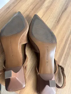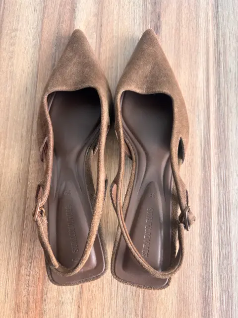 Color: Camel / Marrón • Material: Imitación gamuza (acabado aterciopelado) • Diseño: Punta fina con corte elegante y correa ajustable al talón • Estilo: Slingback con tacón medio cuadradoStradivariusTalla 39 europeo