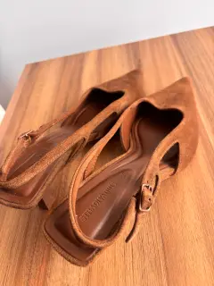 Zapatos destaponados en gamuza. Color: Camel / Marrón • Material: Imitación gamuza (acabado aterciopelado) • Diseño: Punta fina con corte elegante y correa ajustable al talón • Estilo: Slingback con tacón medio cuadradoStradivariusTalla 39 europeo