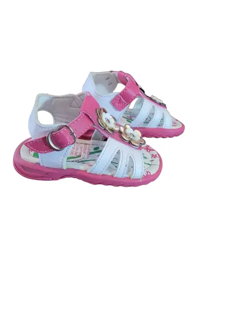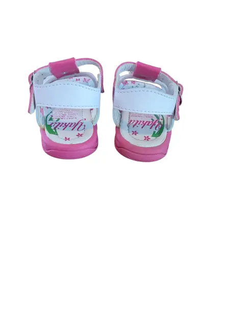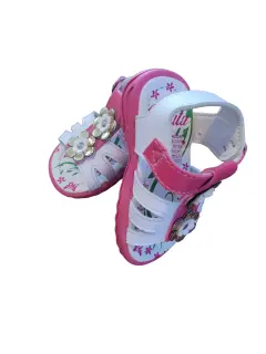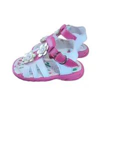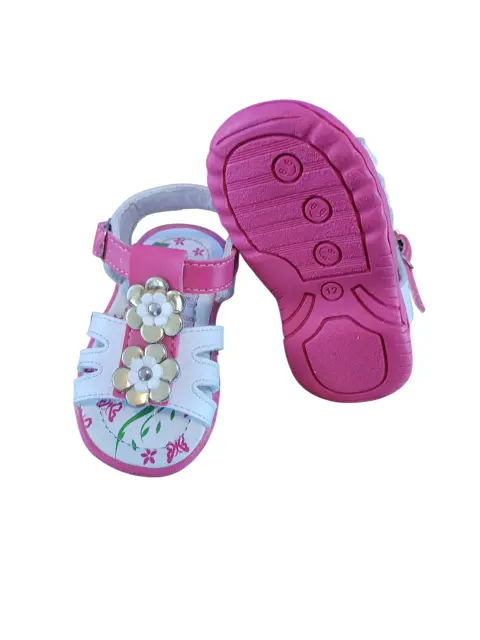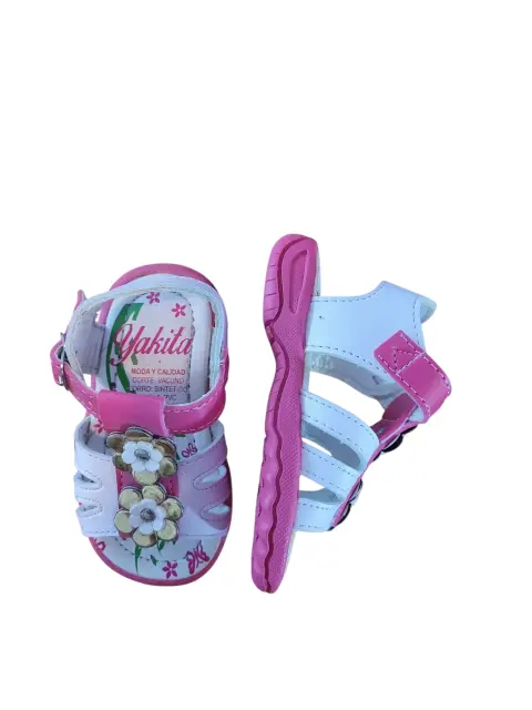 Sandalia Casual de Bebe Yaquita, talla 12, colores blanco y rosado con flores blancas y dorado, cierre de broche, suela sintética antideslizante, nuevos a estrenar sin etiqueta en buen estado cosmetico.