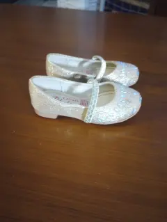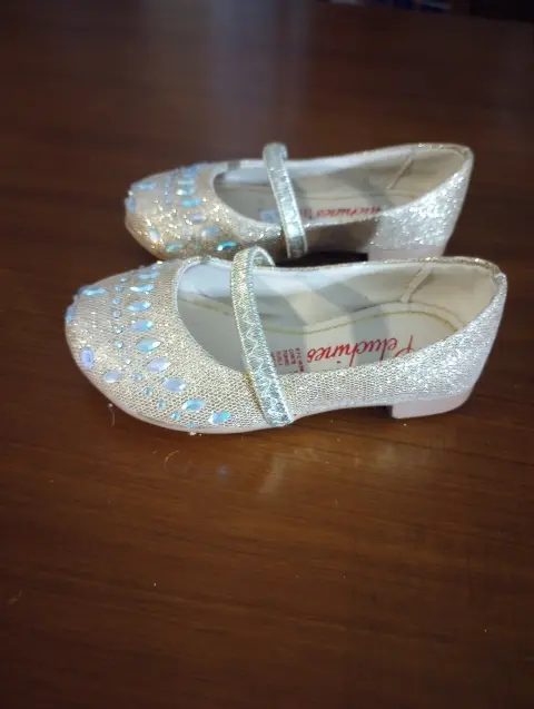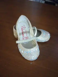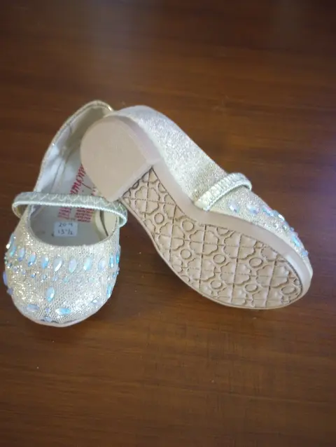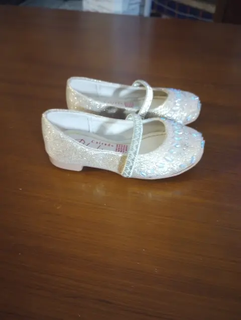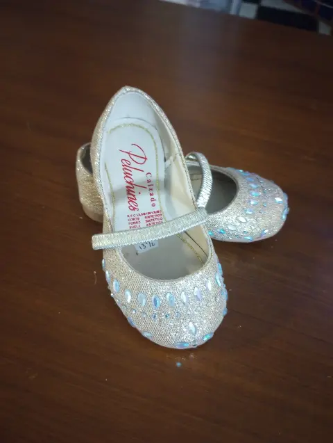 Zapatitos de vestir Peluchines, talla 13.5, color dorado con acentos de piedras multicolor, Banda elastica Al frente, plantilla semiacolchada, suela sintetica antideslisante, hechos de material sintetico, Nuevos a estrenar sin etiqueta en buen estado cosmetico.