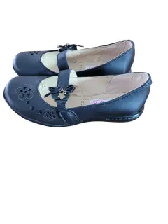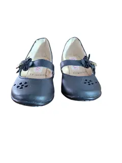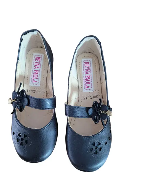 Reyna Paola Zapato Formal Escolar, talla 20, color negro solido, estilo marujane con detalles perforados florales y banda con flores, hechos de cuero y material sintetico, suela exterior sitetica antideslizante, nuevos a estrenar sin etiqueta en buen estado cosmetico.