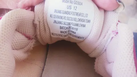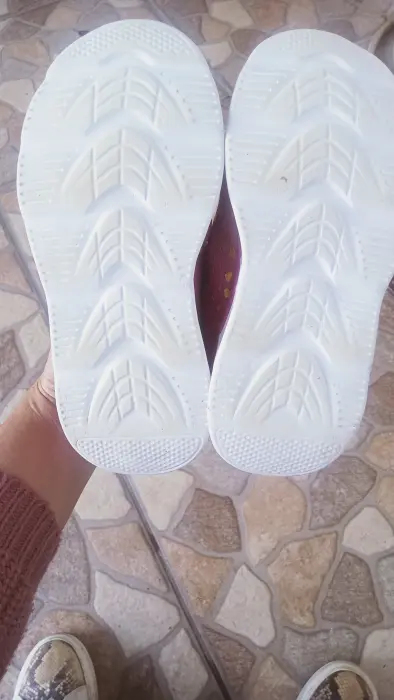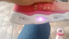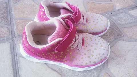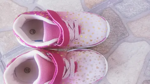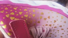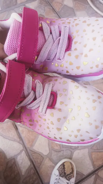 Tenis de niña color rosa degradado con aplicaciones de corazones en color dorado, tiene foquitos que prenden y funciona excelente son talla 12 son bastantes ligeros son tipo Skechers.